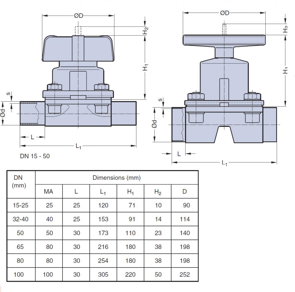Макс. рабочее давление: 10 бар (145 psi), Мембрана DN 65-100 Тефлон 8 бар (116 psi)