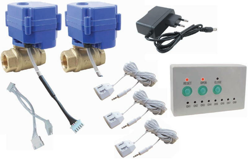 • Состав системы: блок управления, 3 датчика обнаружения протечки AR-WS, 2 шаровых кран в сборе с электроприводом
