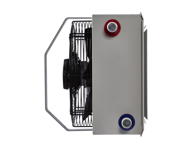 Водяной тепловентилятор устанавливается преимущественно на потолок при помощи кронштейна, который входит в комплект поставки. Выходная решетка в форме анемостата распределяет теплый воздушный поток в четырех направлениях.