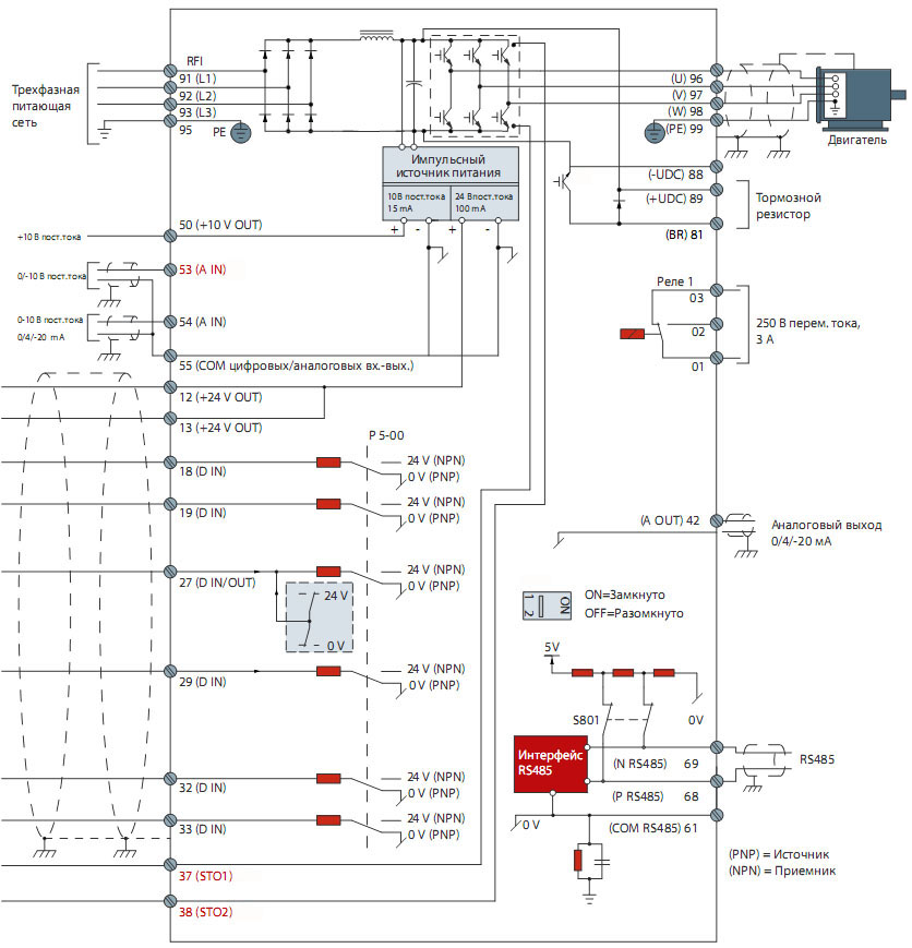 Быстросъемные клеммы делают задачу электрического монтажа при установке и обслуживании привода исключительно простой — для подключения/ отсоединения электропитания, модуля ввода-вывода, периферийной шины и кабелей двигателя нужно лишь вставить/