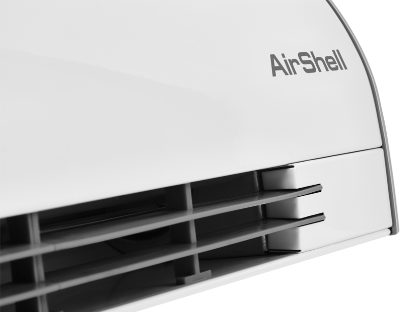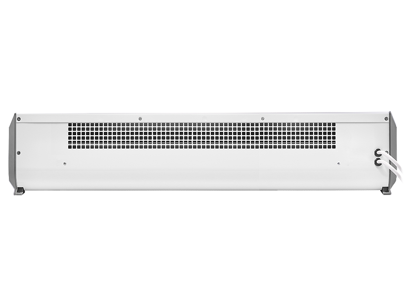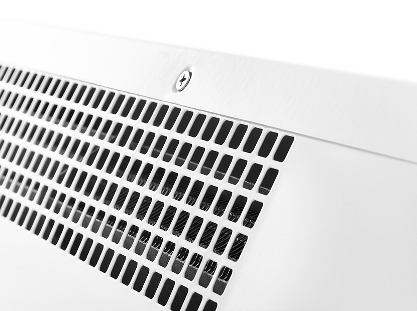 Передняя панель без перфорации блокирует распространение шума от вентиляционных колес направляя его в потолок а не в проходящих людей, что делает завесу значительно тише аналогов в классическом корпусе.