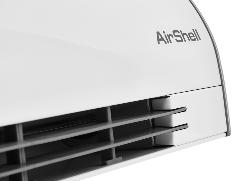 Передняя панель без перфорации блокирует распространение шума от вентиляционных колес направляя его в потолок, а не в проходящих людей, что делает завесу значительно тише аналогов в классическом корпусе.